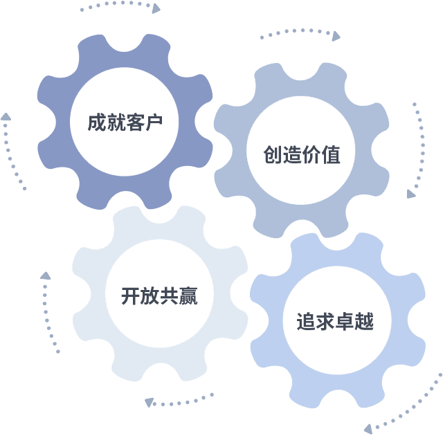 成就客户是一切决策的出发点,,,创造价值是衡量所有工作的标准,,,追求卓越是我们做事做人的态度,,开放共赢是我们的格局也是最终的结果。。。价值观的齿轮环环相扣,,,推动着组织里的每个人不断向前。。